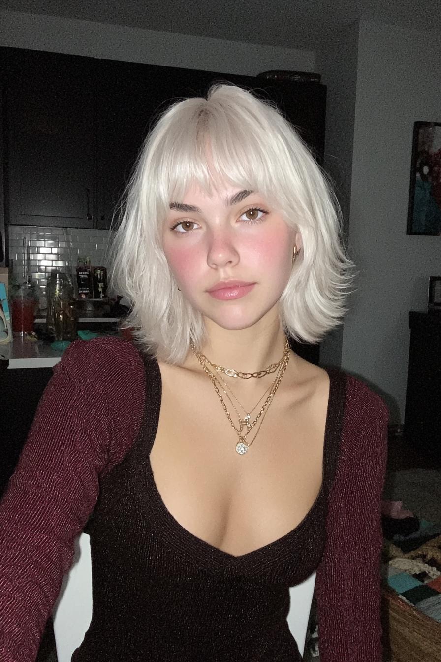 Heller Bob mit Pony, tiefes schwarzes Oberteil und goldene Kettenschichten vor einer dunklen Küchenkulisse.
