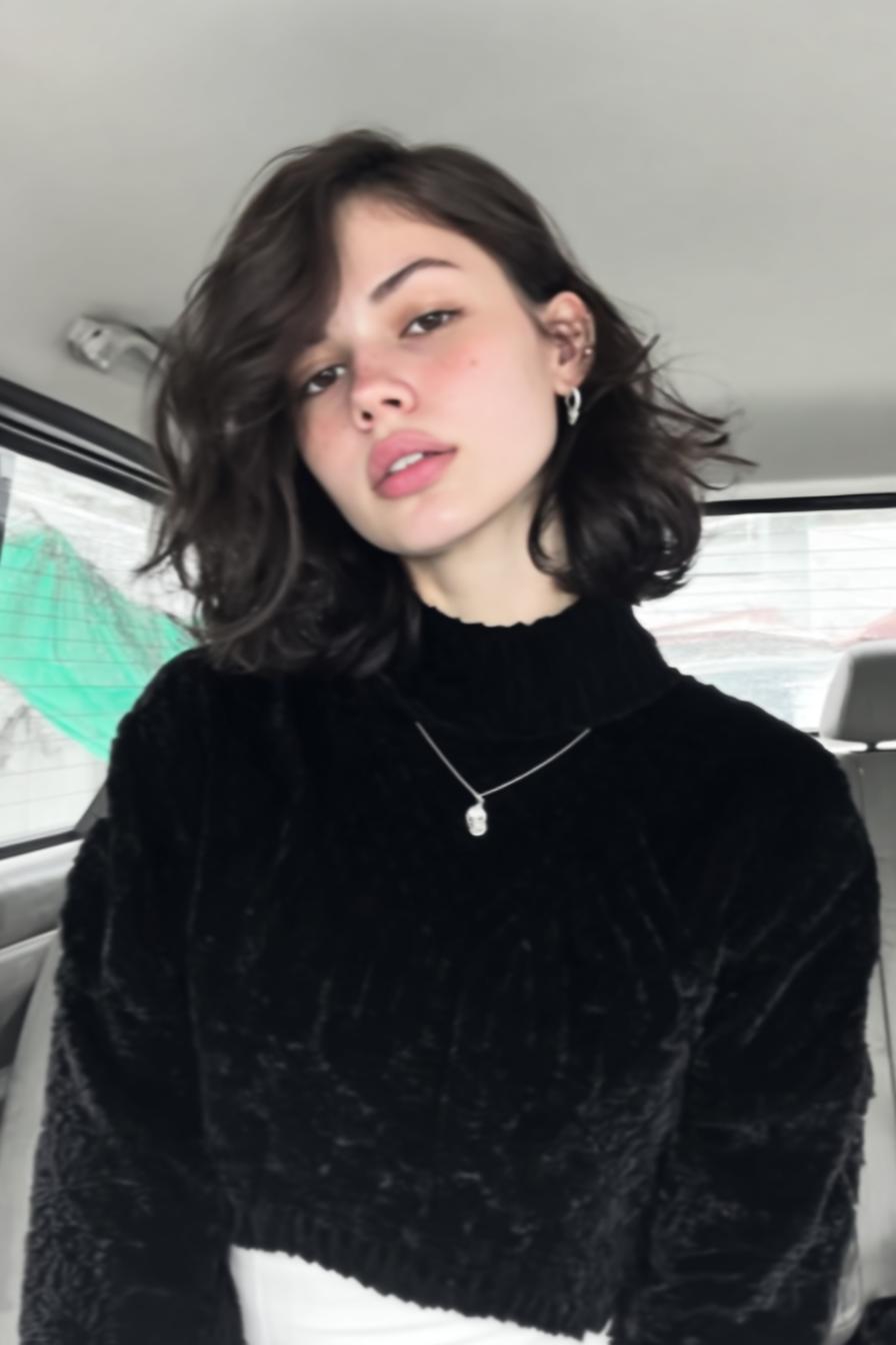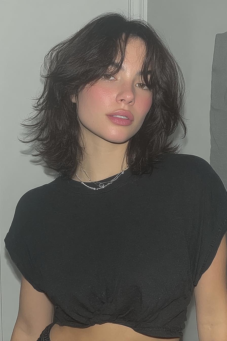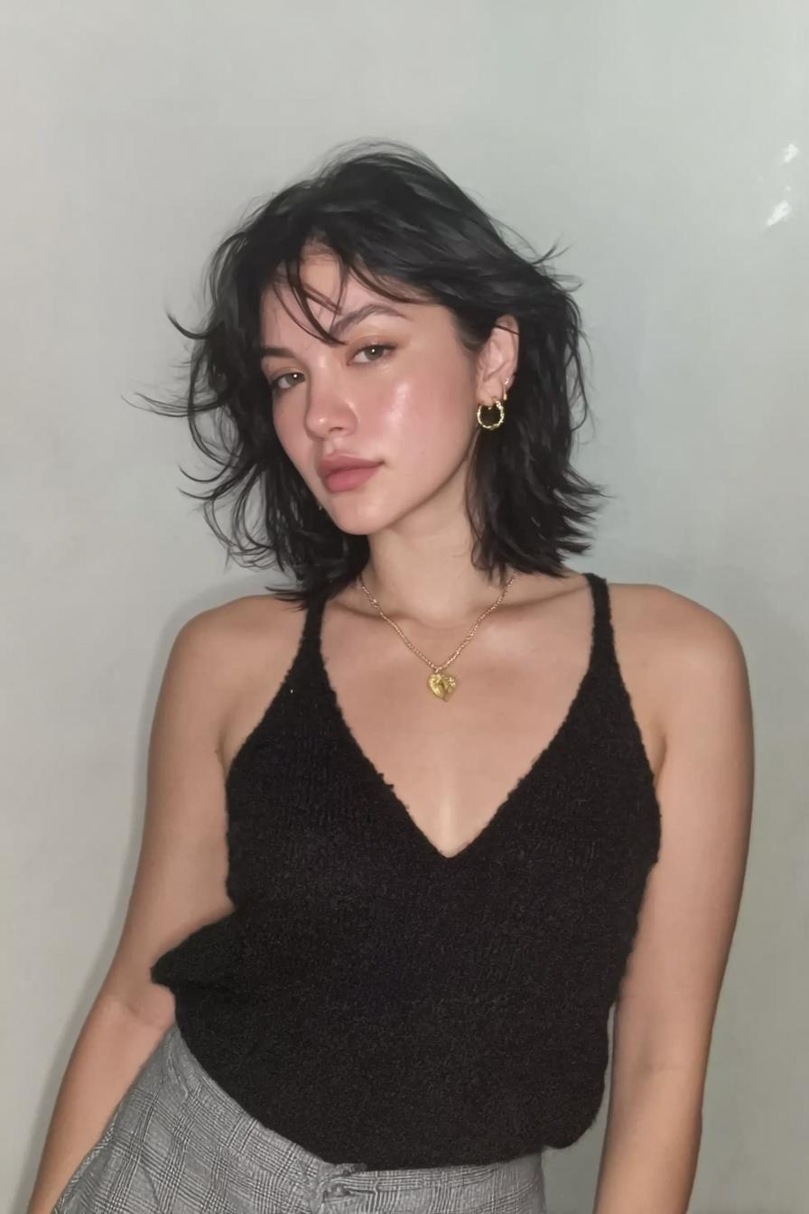 Ein strukturierter, kinnlanger Shag-Bob trifft auf ein ärmelloses Rollkragen-Top. Weiches Indoor-Licht und natürliche Textur sorgen für einen entspannten, modernen Look.