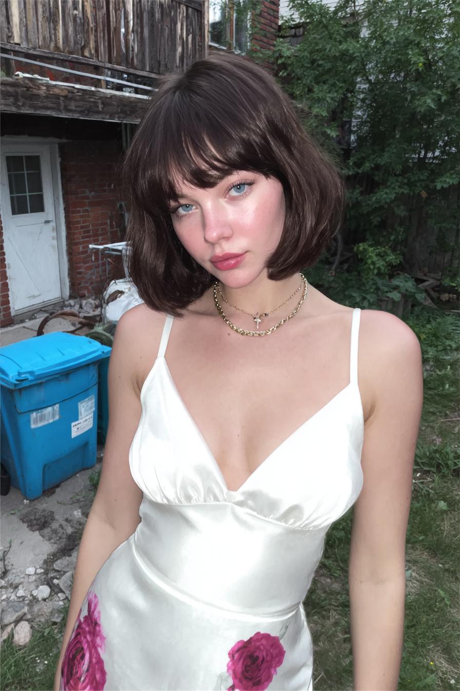 Eine Person in einem cremefarbenen, seidigen Kleid mit Rosenmotiv steht im Garten vor Backsteinwänden und einer blauen Tonne; der weiche Ausdruck und das natürliche Licht erzeugen eine ruhige Stimmung.