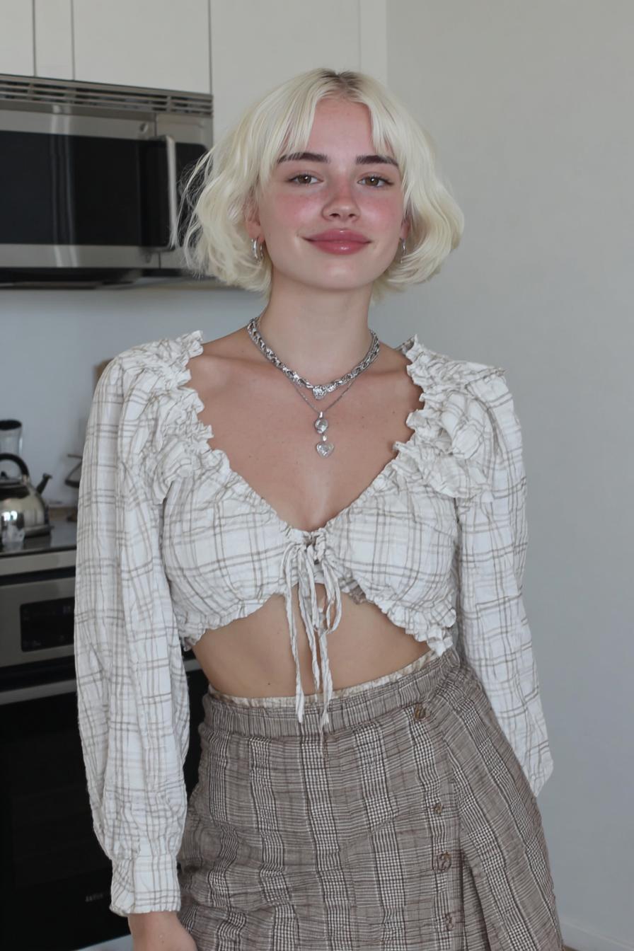 Ein kurz geschnittener, heller Bob kombiniert mit einem karierten Rüschenoberteil und passendem Rock; die moderne Küche im Hintergrund setzt einen klaren Kontrast.