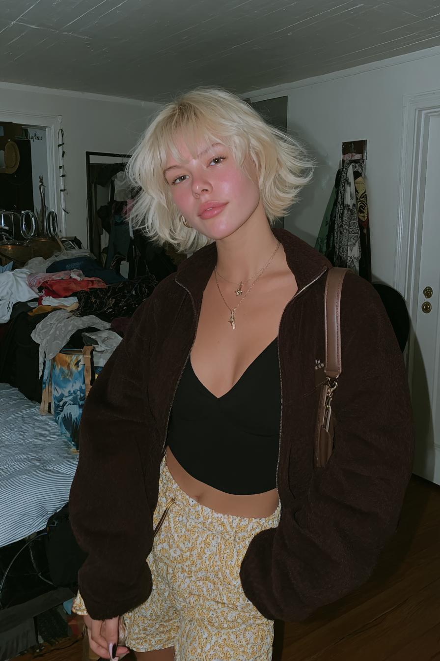 Ein zerzauster, heller Bob, ein dunkles Top und eine gemütliche Jacke treffen auf ein ungeordnetes Zimmer; der spontane Moment vermittelt Unbefangenheit.