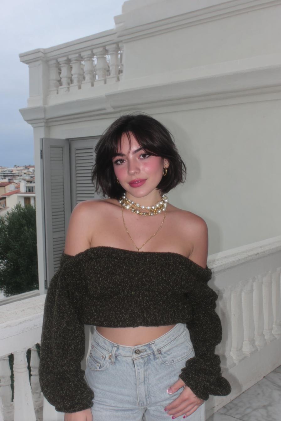Ein weiches Strick-Crop mit weißem Top darunter sorgt für gemütliche Lagen. Die direkte Blitzaufnahme verleiht dem Porträt eine spontane, authentische Note.