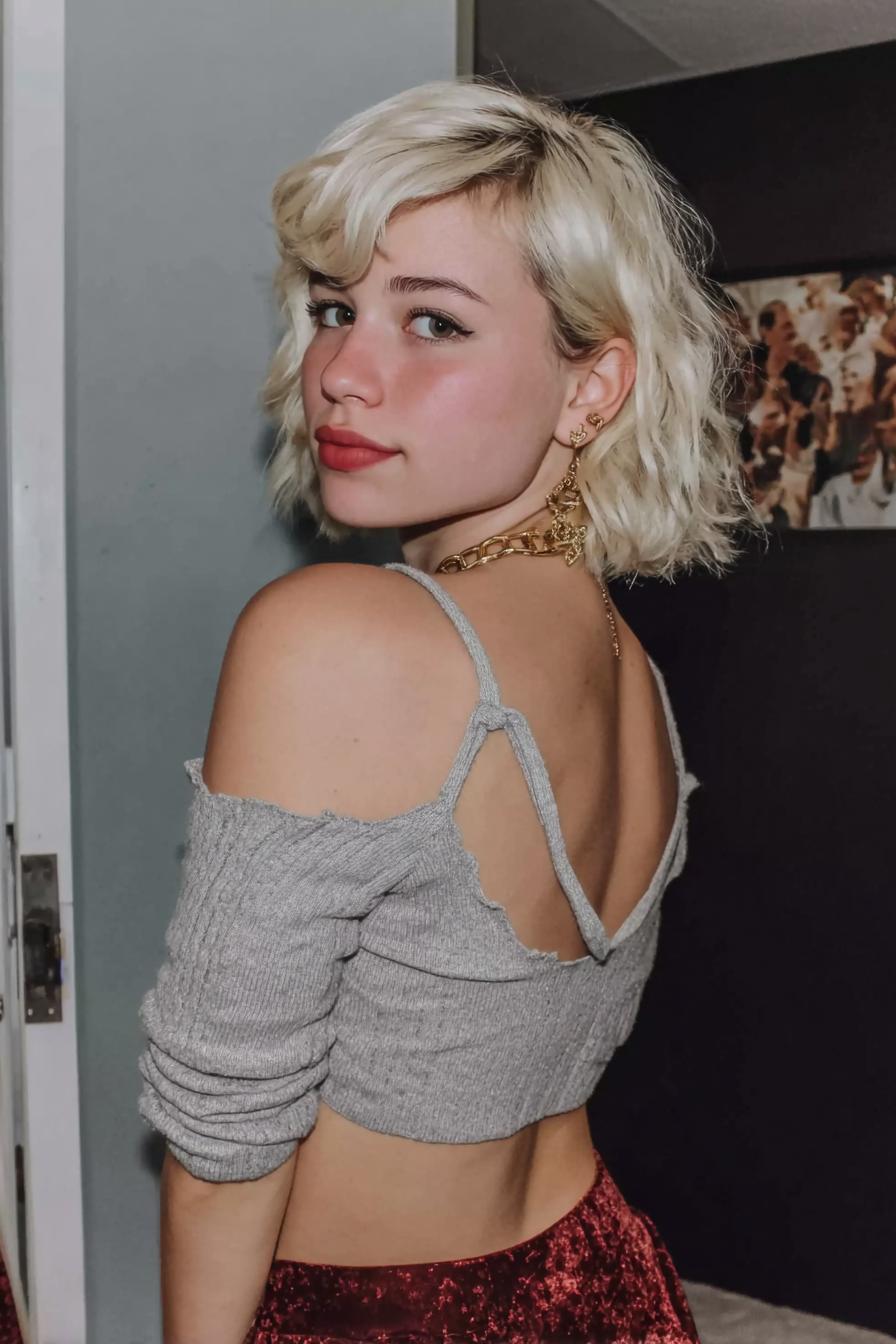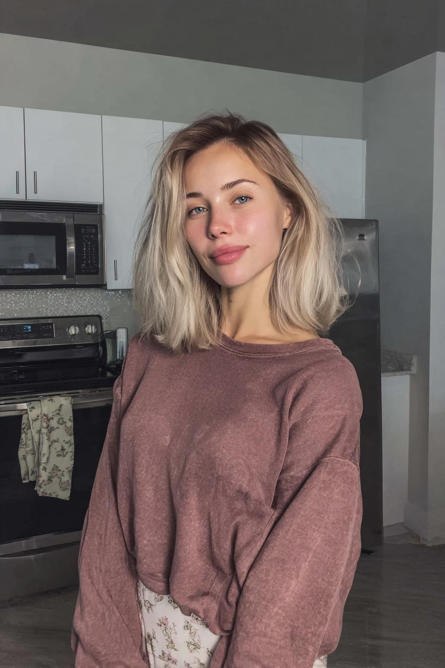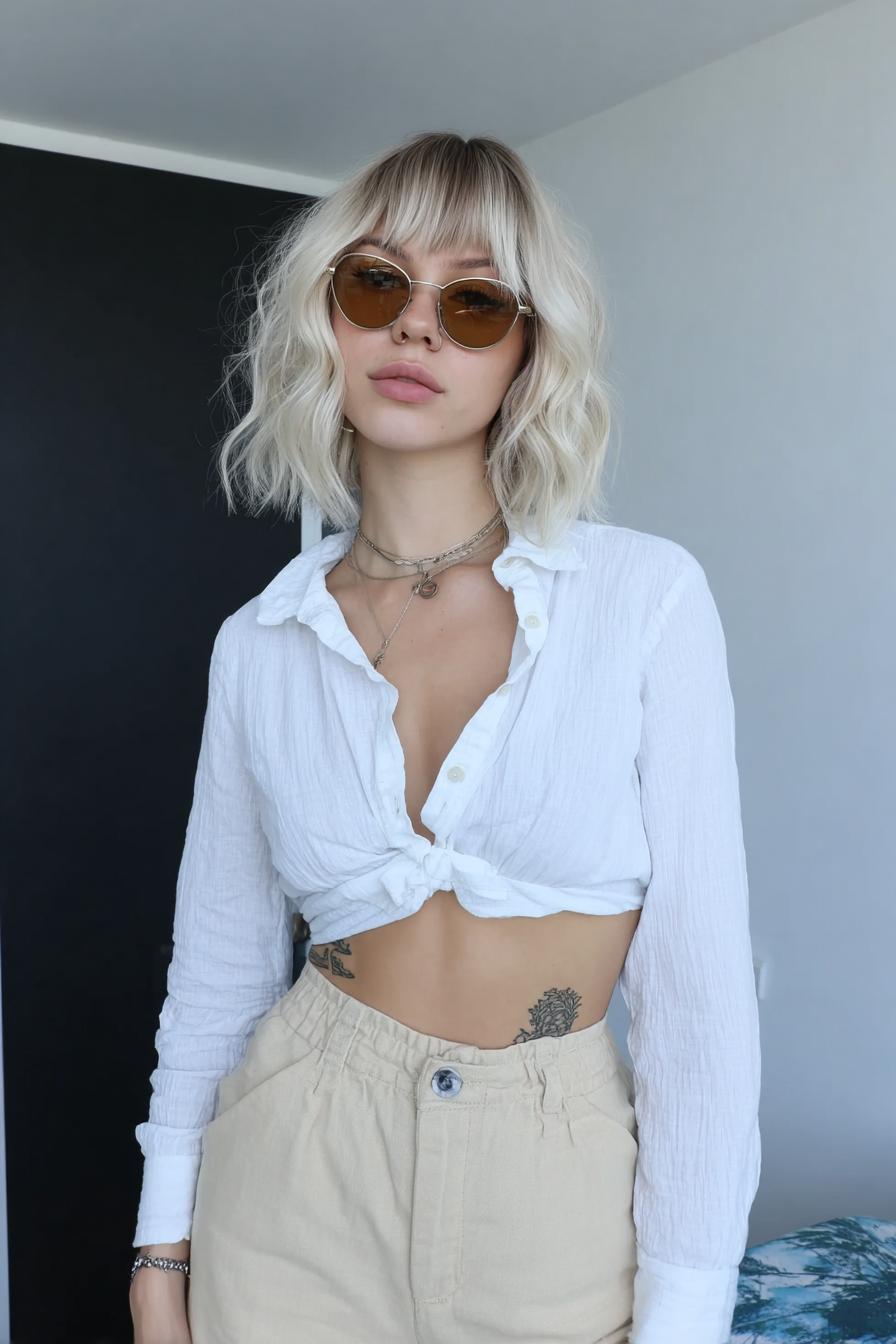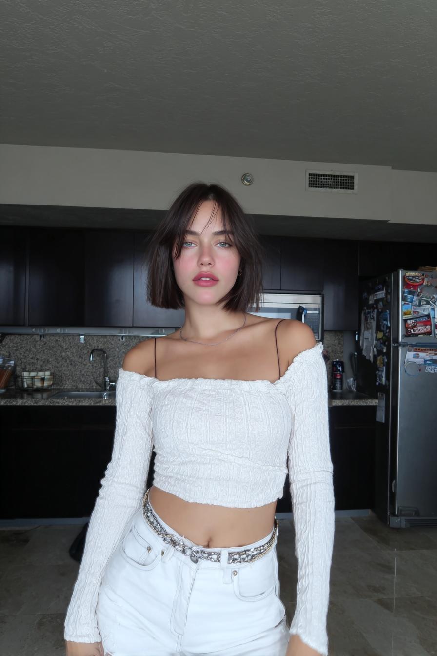 Ein kurzer Platin-Bob mit natürlichem Schwung kombiniert mit einem hellen, schulterfreien Croptop und High-Waist-Jeans in einer Küchenkulisse.