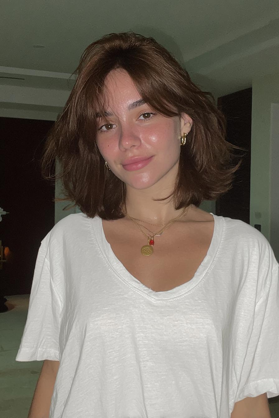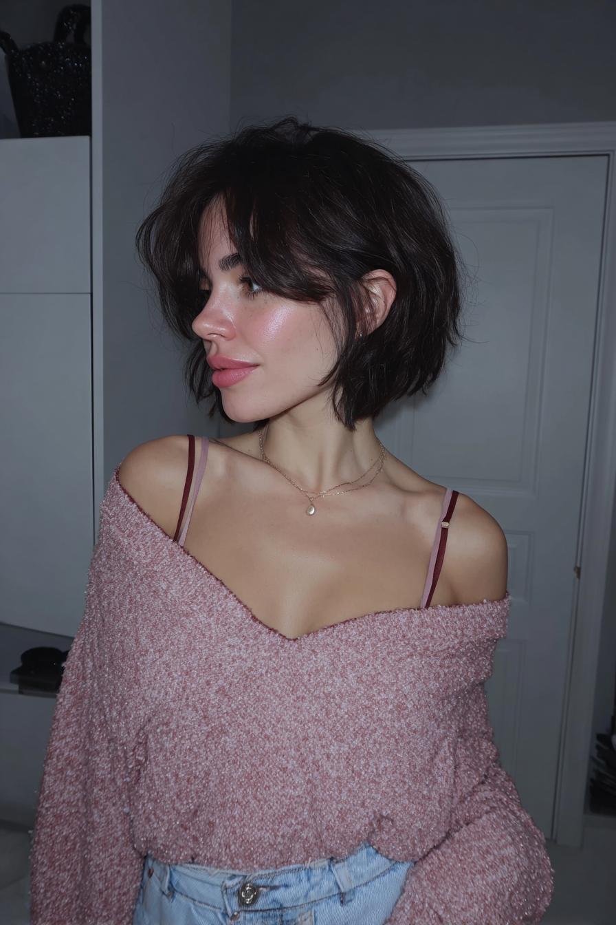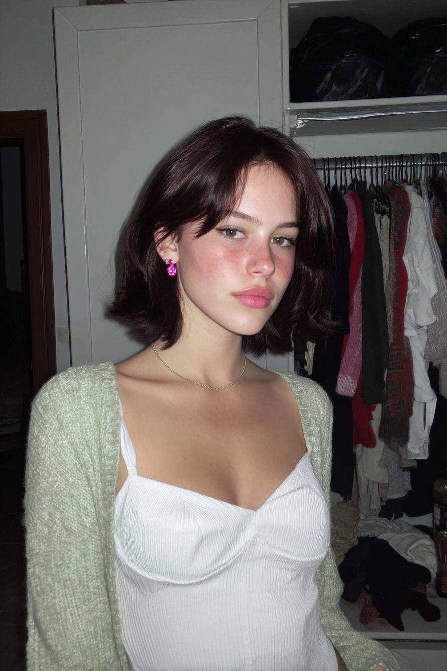 Ein weicher, brünetter Bob auf Schulterhöhe trifft auf ein flauschiges, mintfarbenes Cropped-Sweatshirt und feine Layer-Necklaces in einem Schlafzimmer-Setting.