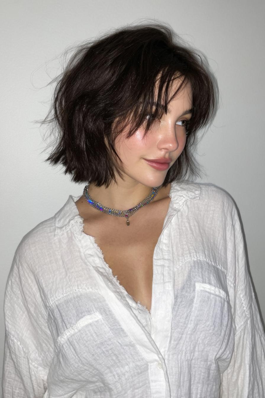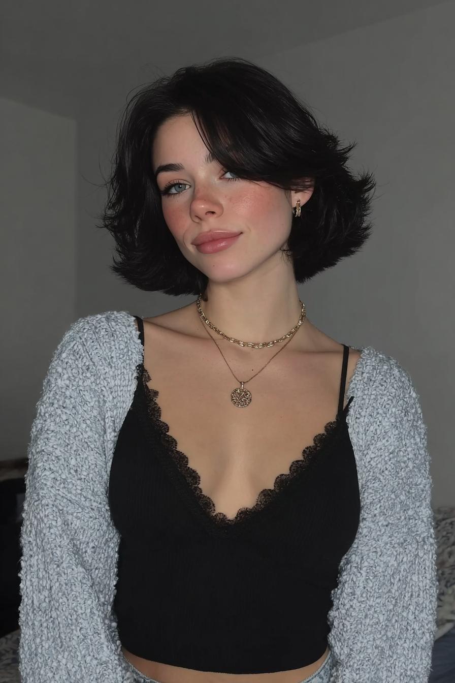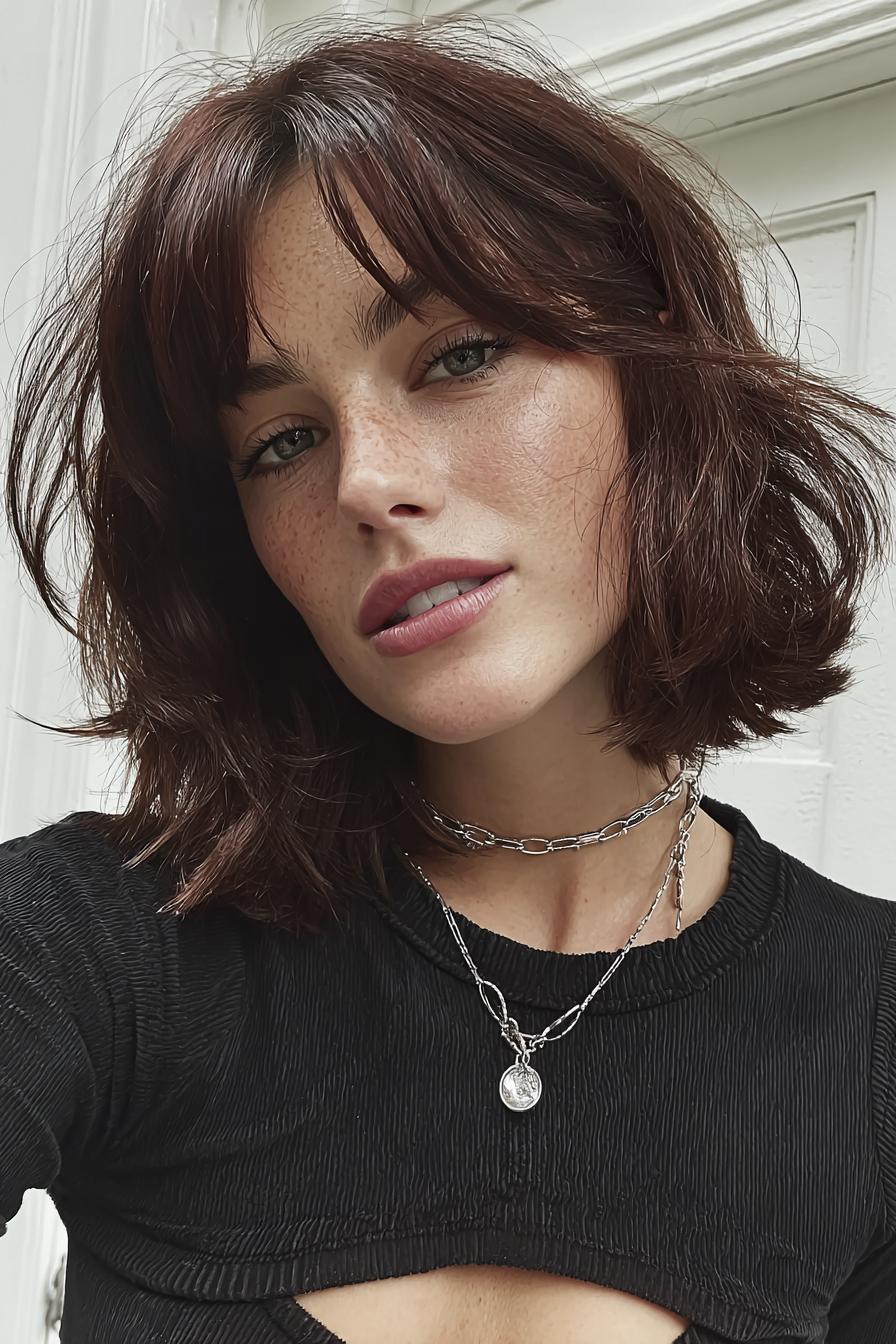 Ein dunkler, welliger Bob mit Pony, silberne Ketten und ein schwarzes, strukturiertes Oberteil; natürliches Licht betont die feinen Sommersprossen.