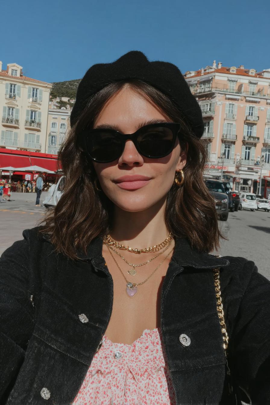 Mit Baskenmütze, schwarzer Jacke und goldenen Ketten wirkt der Look klassisch und leicht. Ein sonniges Straßencafé liefert die passende Kulisse fürs Selfie.
