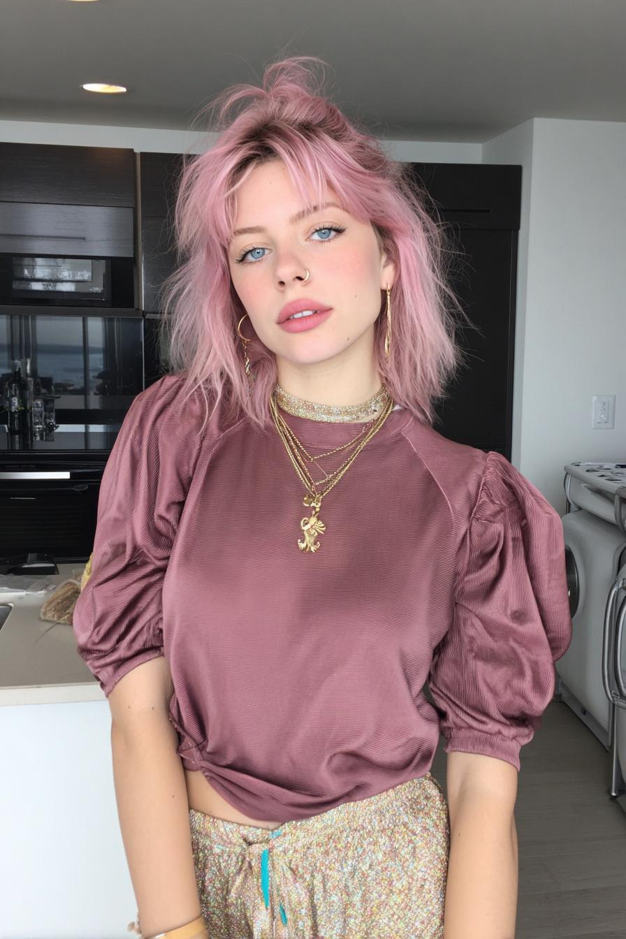 Die rosafarbenen Haare harmonieren mit einer satinierten Bluse und Puffärmeln. Mehrere goldene Ketten setzen glanzvolle Akzente in moderner Wohnkulisse.
