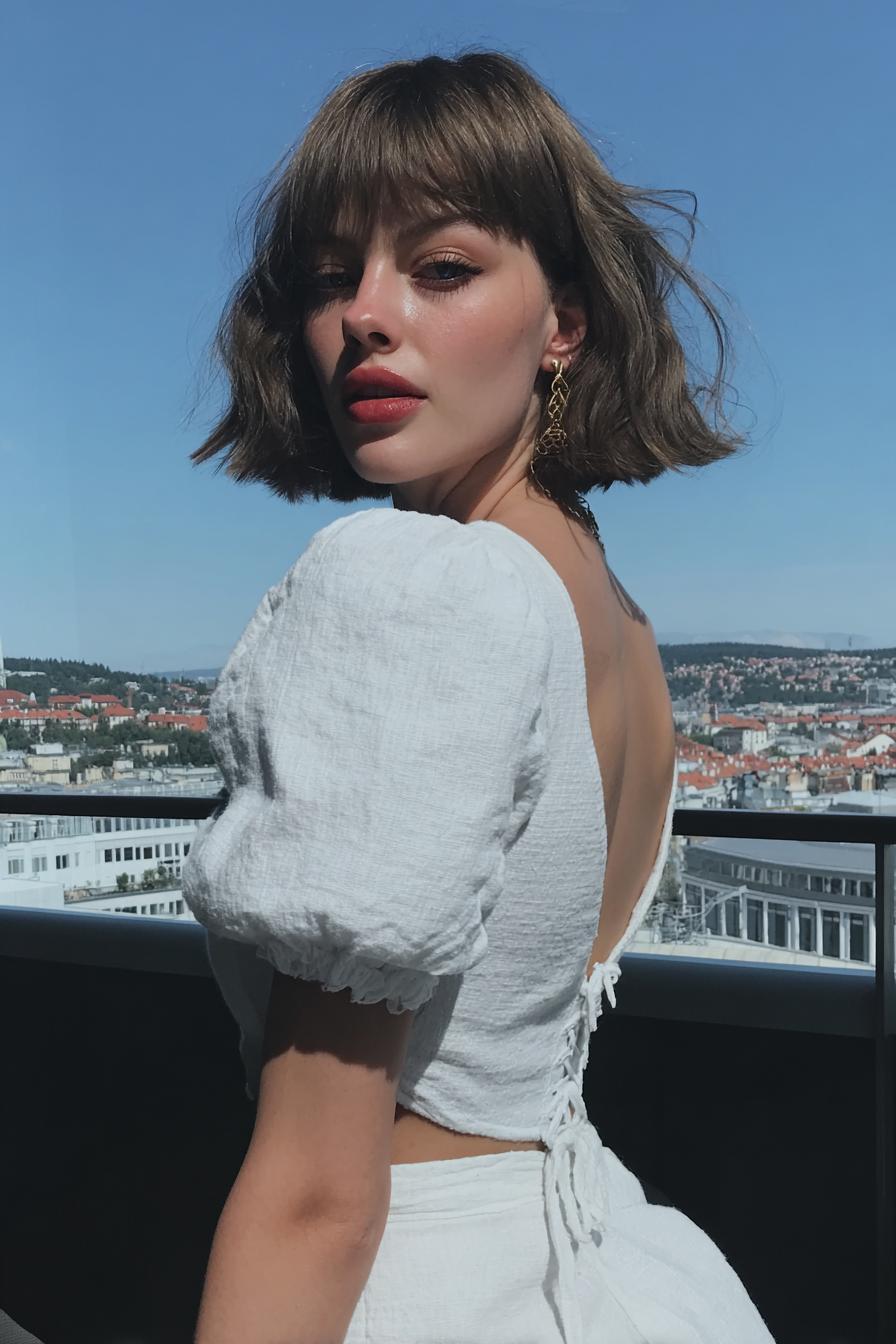 Eine Person mit kurzem Bob und goldenen Ohrringen posiert auf einem Balkon; das weiße rückenfreie Oberteil mit Puffärmeln und das klare Sonnenlicht betonen das urbane Panorama im Hintergrund.