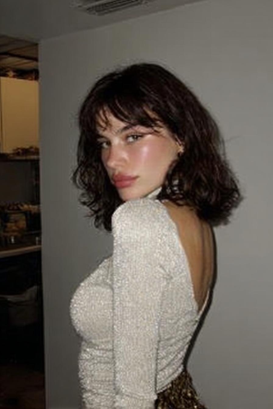 Heller, welliger Bob, rückenfreies Oberteil mit Puffärmeln und weiches Licht aus der Seite.