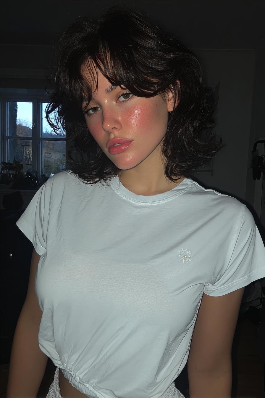 Ein weißes T-Shirt mit kleinem Emblem trifft auf voluminösen, stufigen Pony; der direkte Blitz und der dunkle Hintergrund verleihen dem Porträt eine spontane Ästhetik.