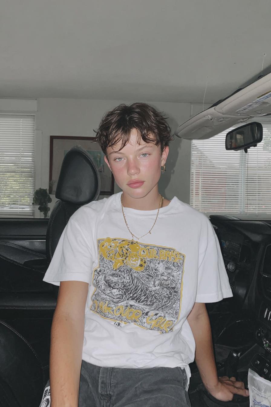 Ein weißes Grafik-Shirt, kurze Frisur und goldene Kette sorgen für unaufgeregte Coolness. Das Setting im Fahrzeug wirkt spontan und ungefiltert.