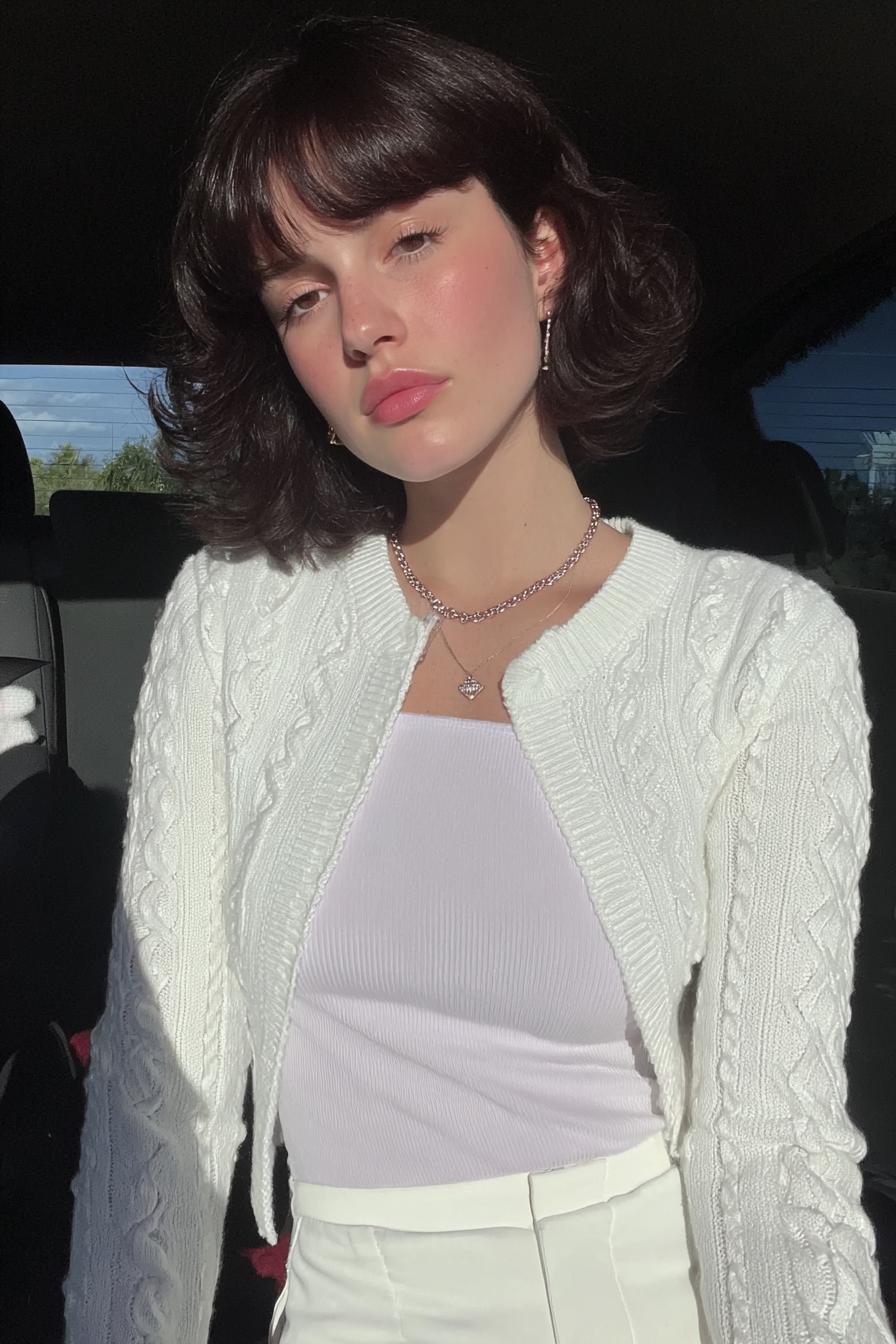 Mit weißem Trägertop, Schleifendetail und silbernen Ketten entsteht ein retro-inspirierter Look. Die kurze dunkle Bobfrisur unterstreicht den nostalgischen Charme.