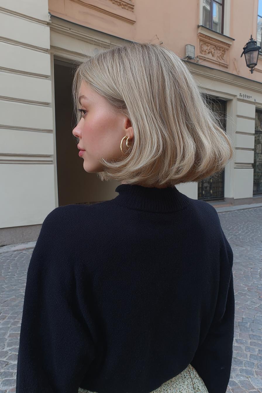 Ein weicher, blonder Bob mit leichtem Schwung und goldenen Creolen. Der seitliche Blick und die ruhige Straßenkulisse unterstreichen die schlichte Eleganz.