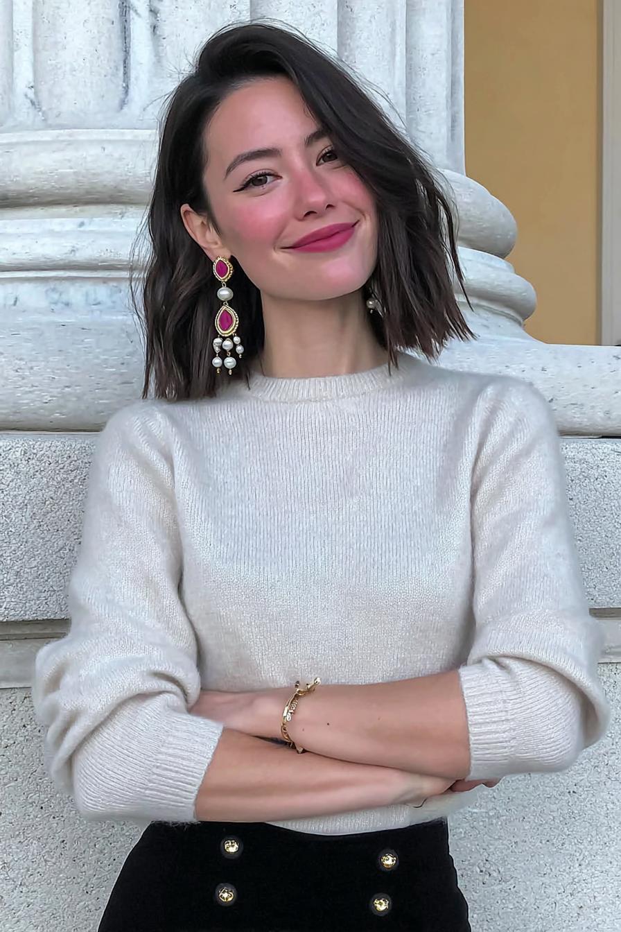 Ein dunkler, leicht gewellter Bob zu einem hellen Strickpullover. Markante, farbige Statement-Ohrringe und ein freundlicher Ausdruck setzen Akzente.