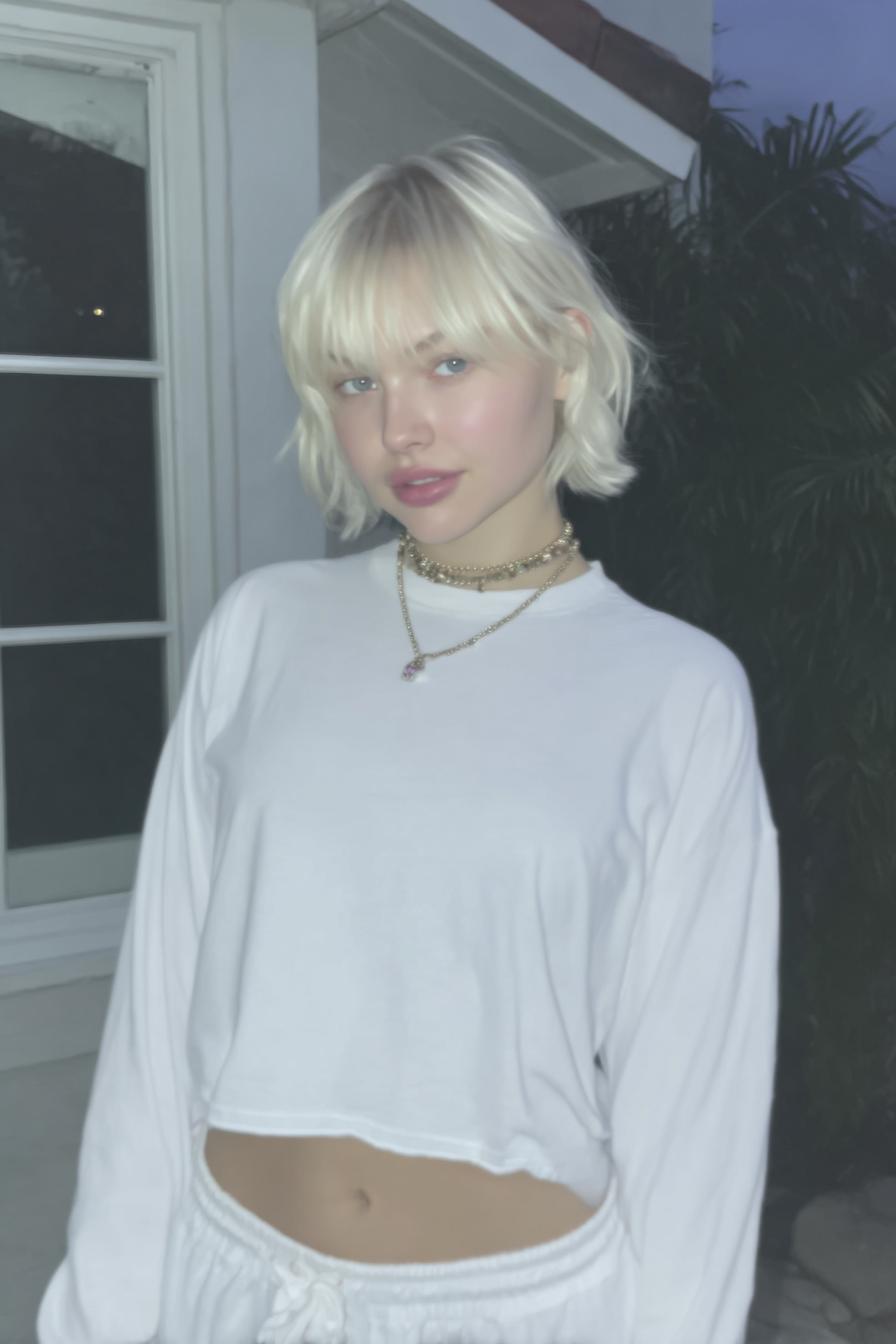 Eine blonde Person mit Bob und Pony steht draußen vor einem Haus, trägt ein weißes Langarmshirt und dezenten Schmuck. Das weiche Licht und der leicht unscharfe Look verleihen dem Bild eine ruhige, verträumte Stimmung.