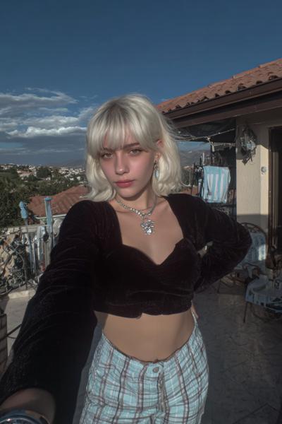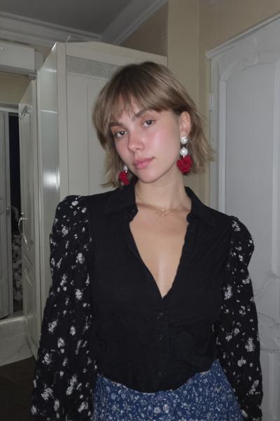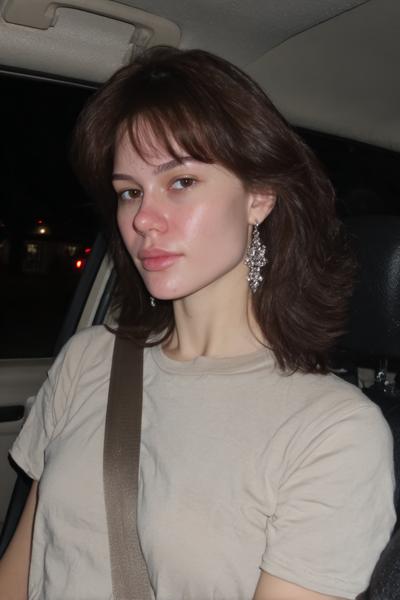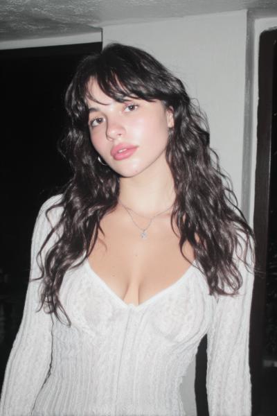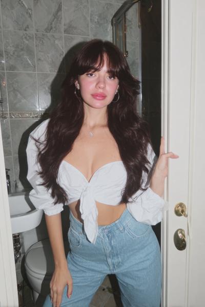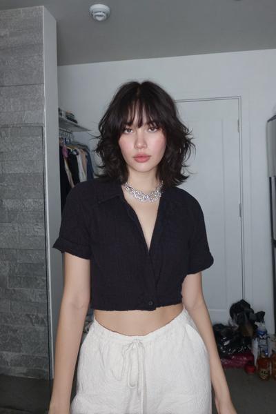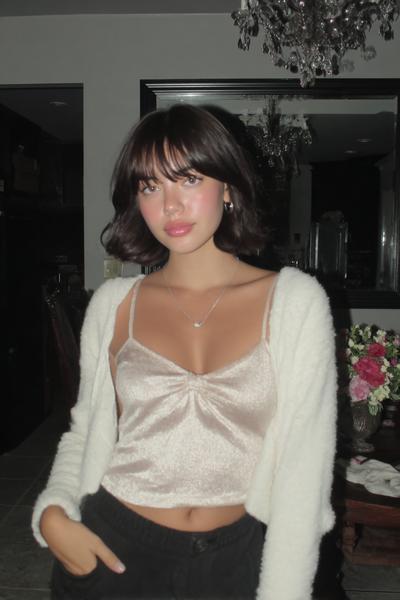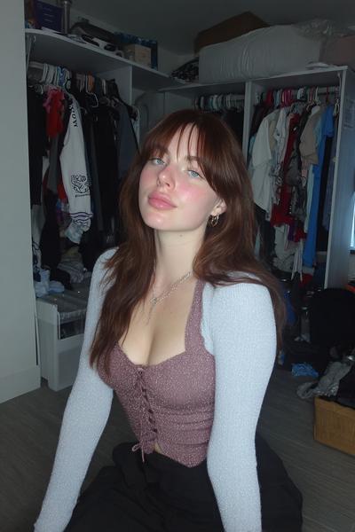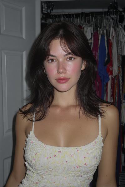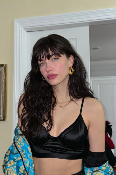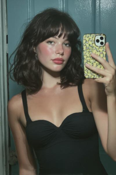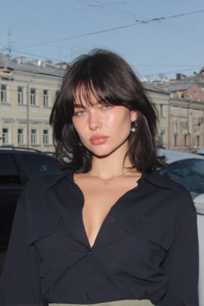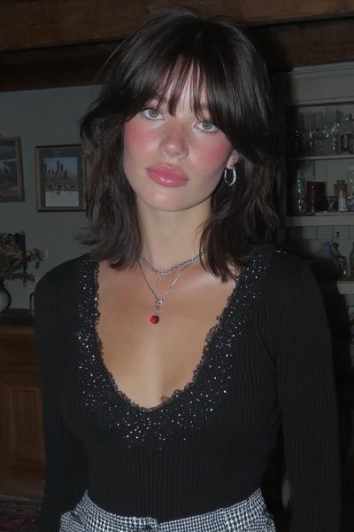 Die Curtain Bangs sind leicht angehoben und geben dem zerzausten, gestuften Haar eine freche Note. Ein bisschen Texturspray, dann mit Fingern twisten. Ich mag diesen rauchigen Party-Vibe—unperfekt, aber maximal charmant.