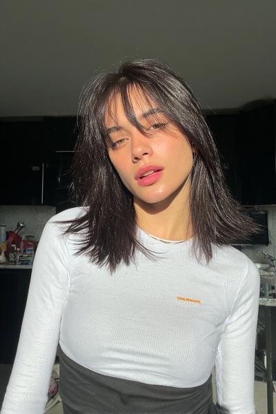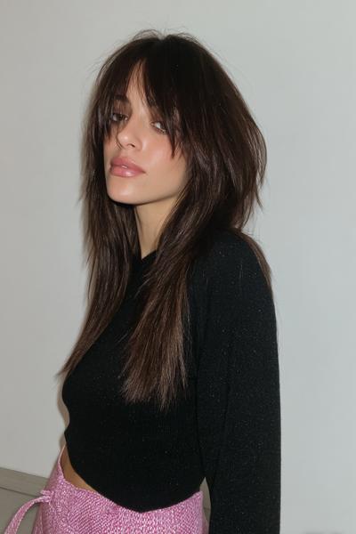Diese federleichten Layers mit Curtain Bangs bringen 90s-Flair ins Spiel. Föhne das Deckhaar nach außen, arbeite etwas Trockenspray ein. Das Finish wirkt beweglich, frisch und schön face-framing – genau mein Ding.