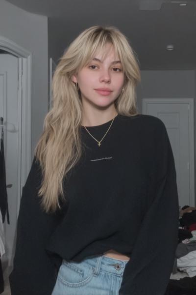 Die langen Curtain Bangs verschmelzen mit weichen Stufen – perfekt für Half-Up-Styles. Ich curve sie mit dem Glätteisen leicht nach außen, etwas Volumenspray am Ansatz, und der Look wirkt sofort filmisch und schmeichelhaft.