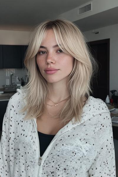 Hier treffen choppy Curtain Bangs und lässige Layers auf urbane Coolness. Die leicht zerzauste Struktur bringt die Augen hervor, während die Längen locker schwingen. Ich würde mit Trockenshampoo und einer Rundbürste arbeiten – ergibt diesen frechen, französisch angehauchten Vibe.