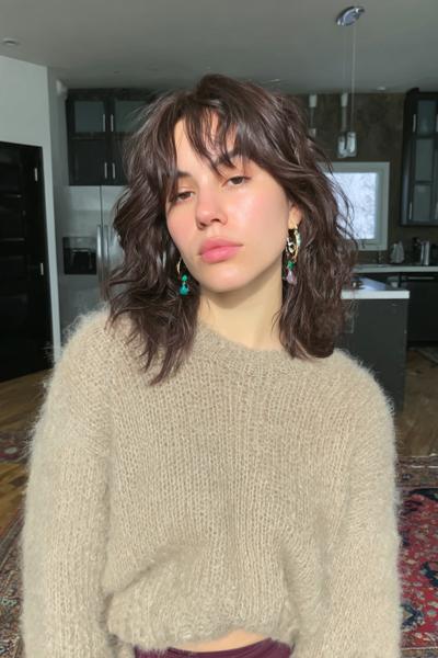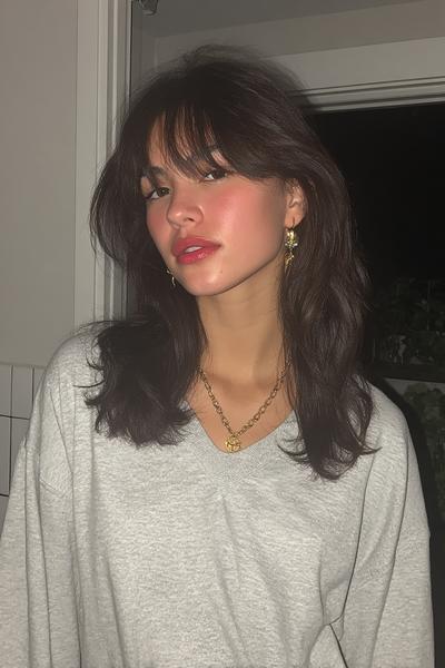 Diese choppy Curtain Bangs bringen Edge in den soften Mullet-Shag. Ich lasse die Spitzen bewusst fransig, style mit Paste—so entsteht dieser coole, fast französische Nonchalance-Look.