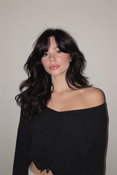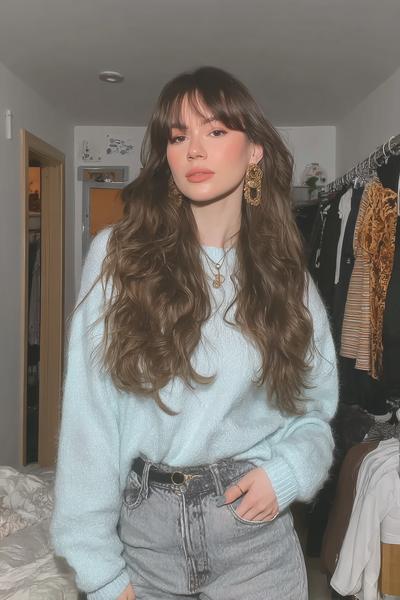 Die dichten, leicht geschwungenen Curtain Bangs treffen auf lange, natürliche Wellen – pure French-Girl-Energie. Ich liebe den Kontrast aus seidigem Glanz und rauer Textur. Ein Hauch Salzspray, etwas Glanzserum, und die Augen stehen sofort im Fokus.