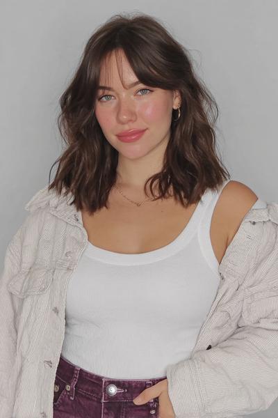 Der volle Pony rahmt die Augen, während lange, sanfte Wellen unterhalb des Kinns starten. Wichtig: Seiten leicht ausdünnen, damit Breite reduziert wird. So bleibt Fülle vorn, und der Hals-Kinn-Bereich wirkt definierter – ein Lieblingslook für runde Gesichter.
