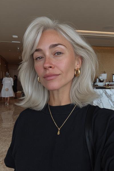 Der silbrige Bob mit Soft-Flip öffnet den Hals und setzt klare Kanten. Minimaler Seitenscheitel, Spitzen leicht ausgestellt – so wirkt die Kontur schmaler. Ideal als Doppelkinn-Frisur für mollige Frauen mit rundem Gesicht, clean und dennoch feminin.