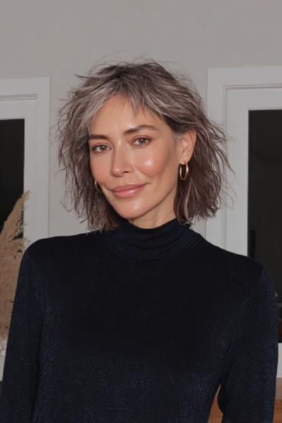Dieser mittellange Shag lebt von Struktur und feinen Stufen. Das Salz-und-Pfeffer-Grau bekommt Tiefe, wenn du mit Trockenshampoo und Wachs spielst. Ergebnis: frech, bewegt, wunderbar unperfekt – pure Leichtigkeit.
