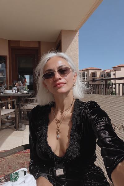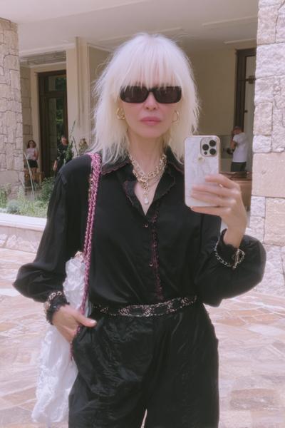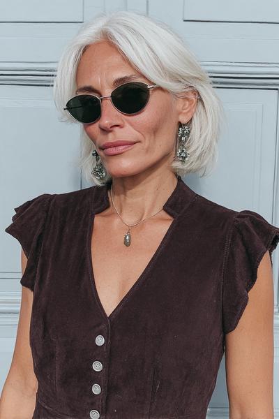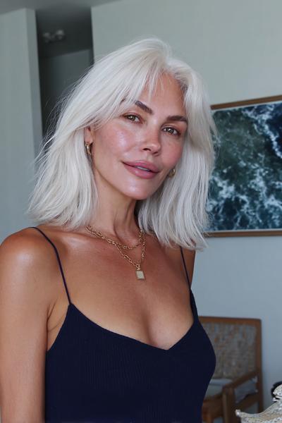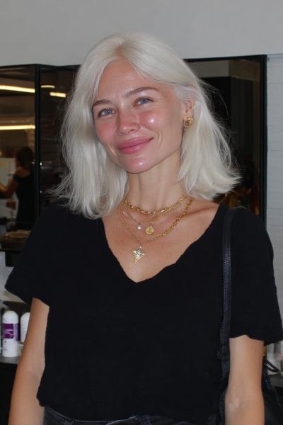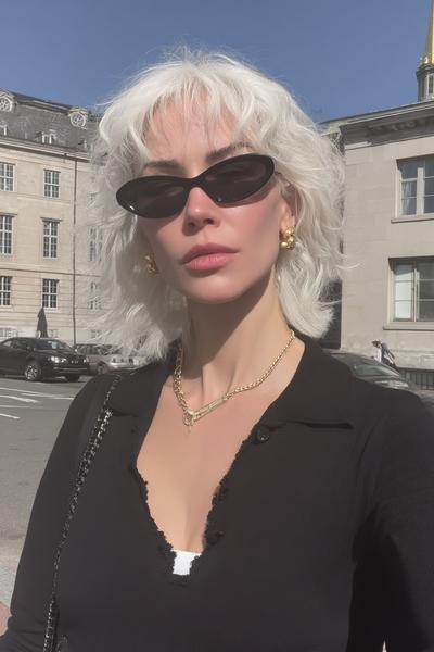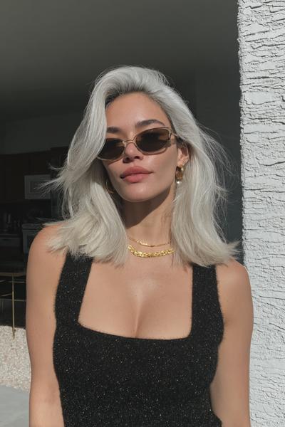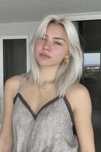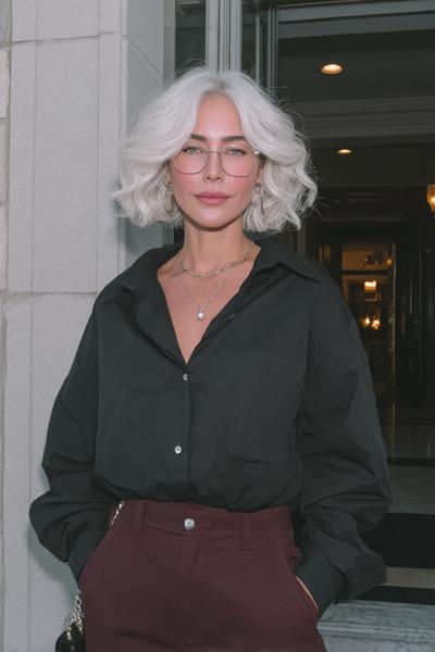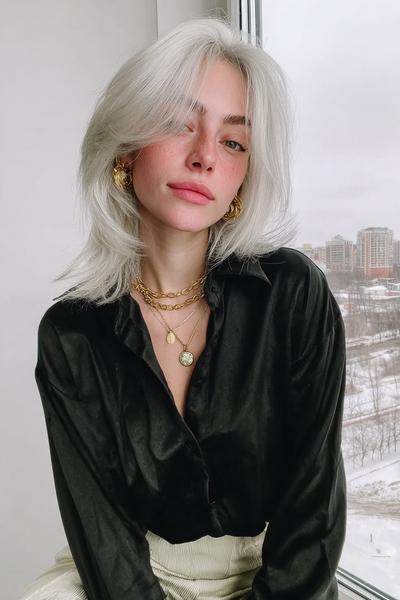 Dieser Seitenscheitel öffnet das Gesicht, die silbrigen Längen wirken luxuriös. Ein bisschen Volumenpuder am Ansatz, Spitzen leicht eindrehen – fertig ist der edgy, alltagstaugliche Chic.