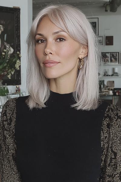 Langer Bob in Silbergrau mit sanften Curtain-Bangs