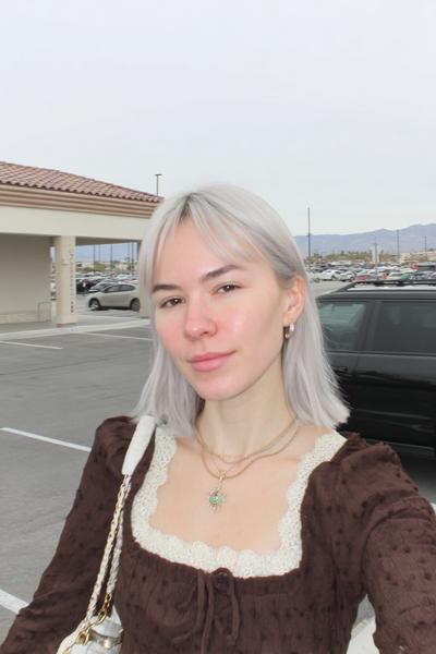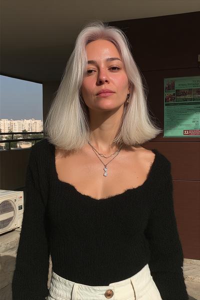 Ein glatter, mittellanger Bob in Perlgrau mit softem Pony – clean, aber frech. Ich liebe den subtilen Glanz; mit Hitzeschutz und Gloss-Spray bleibt die Linie edgy und die Farbe kristallklar.