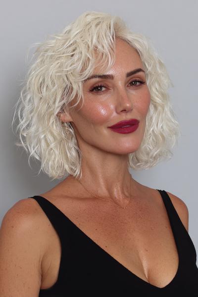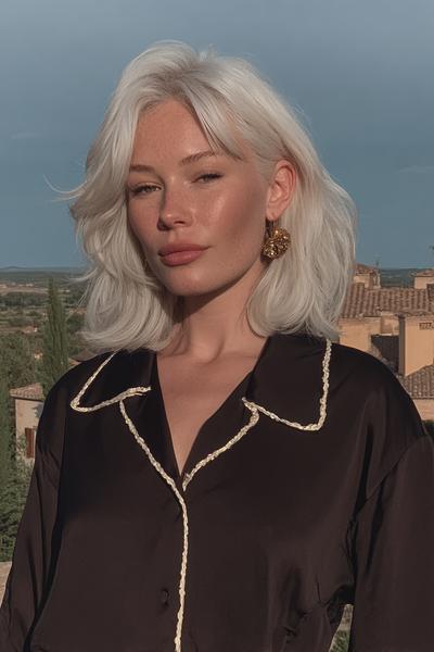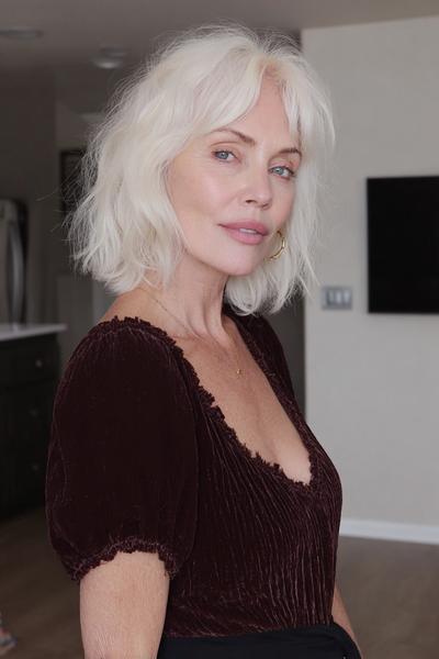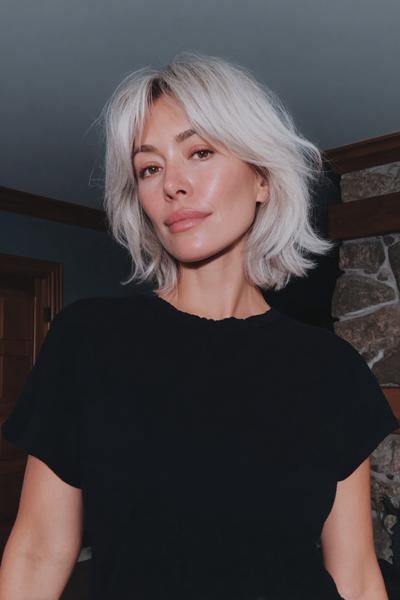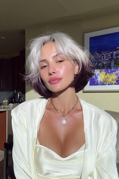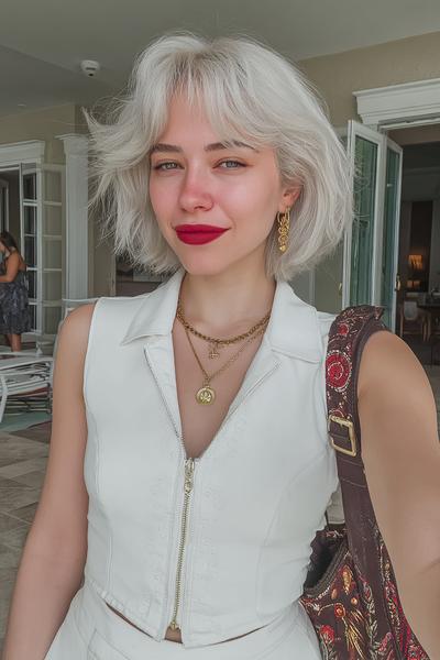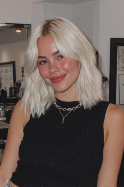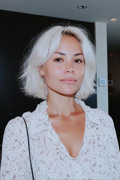 Ich liebe den weichen Schwung und das kühle Silber: ein luftiger Bob mit feinen Stufen, der sofort Frische bringt. Mit etwas Sea-Salt-Spray und Glanzserum entsteht dieses lässige, freche Finish – elegant und spielerisch zugleich.