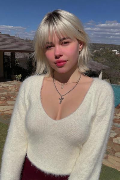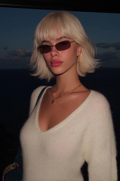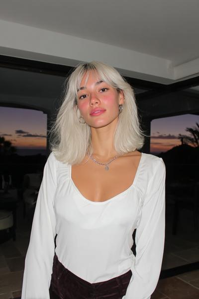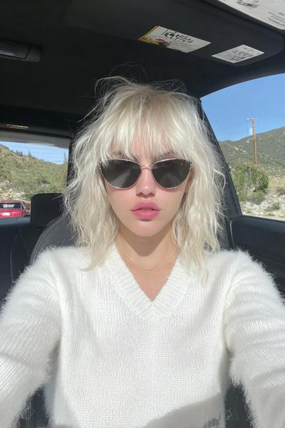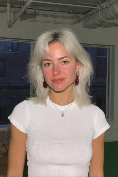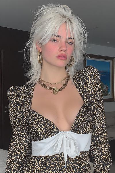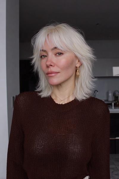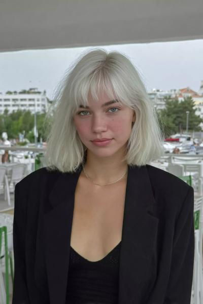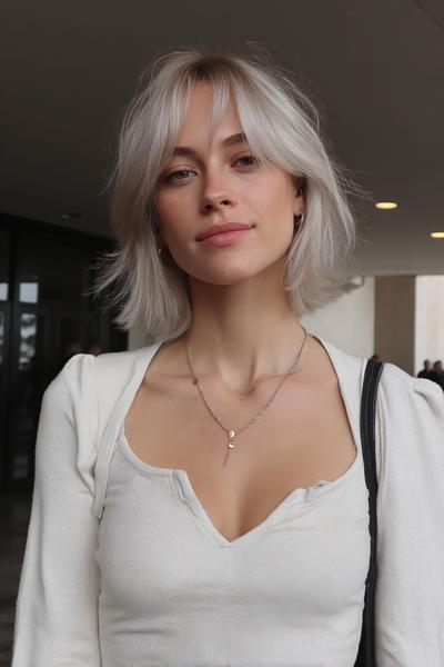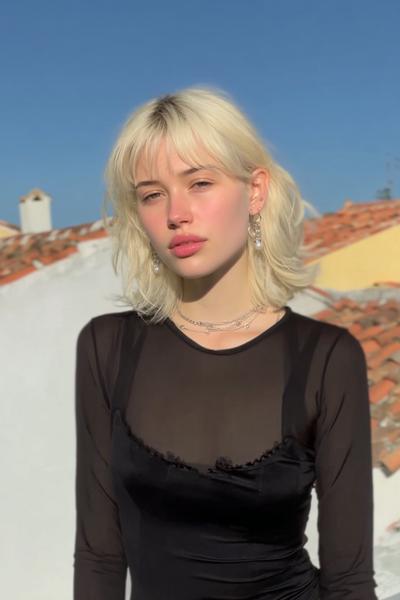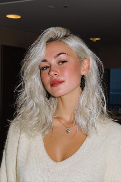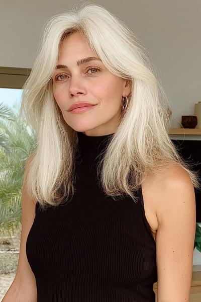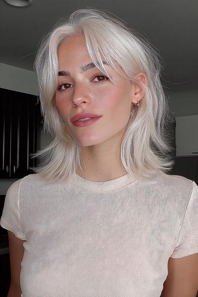 Die langen Fransen umspielen die Wangenknochen und geben Softness. Ich arbeite gern mit Glanzspray und einer leichten Rundung beim Föhnen – so wirkt das Weiß luxuriös statt streng.