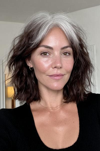 Das breite graue Money-Piece macht den mittellangen Cut sofort charakterstark. Ein toller Trick, wenn du Grau wachsen lässt. Mit Wellen und Glanzspray wirkt es hochwertig, aber bleibt schön unkompliziert.