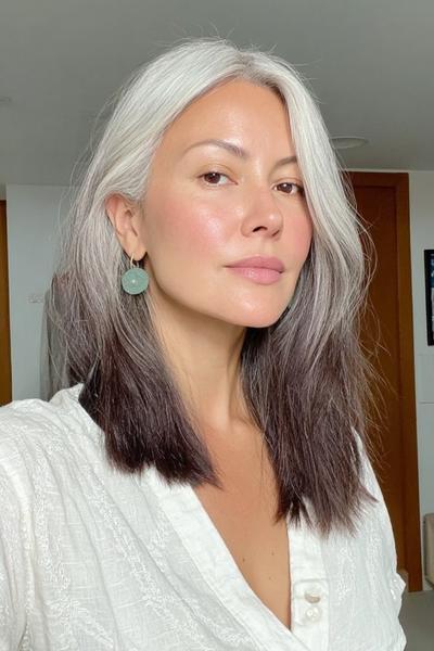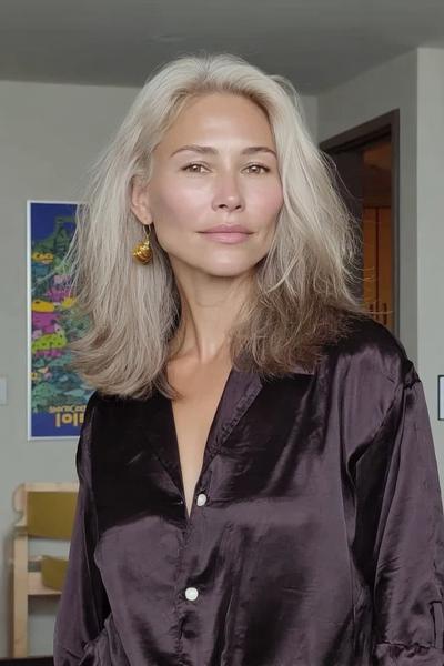 Minimalistisch, aber mit Statement: Glattes graues Haar, dezent gestuft, wirkt clean und frech. Ein Hauch Öl in die Spitzen, Ansatz natürlich. Für mittellang ideal, wenn du Ruhe und Kante kombinieren willst.