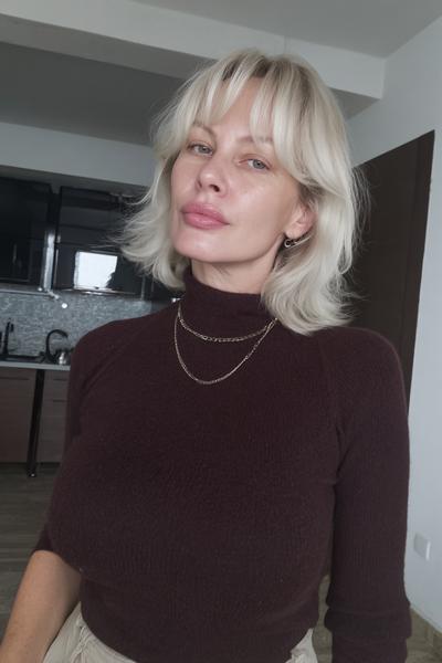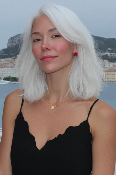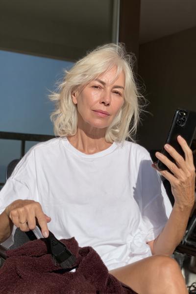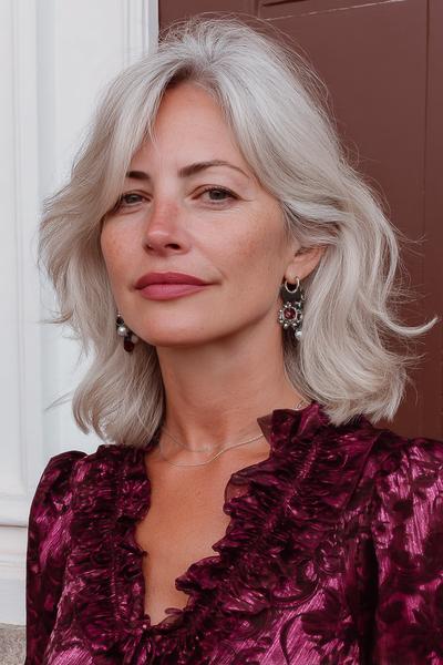 Kurze Stirnfransen geben frechen Kick, die Stufen bringen Luftigkeit. Das grau-blonde, mittellange Haar wirkt nonchalant. Ich style es mit leichter Creme – formbar, aber nie beschwert. Très cool.