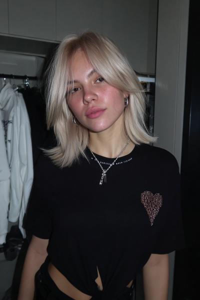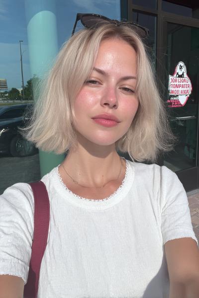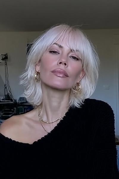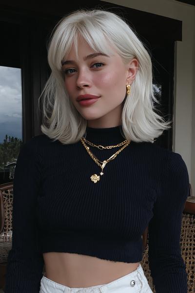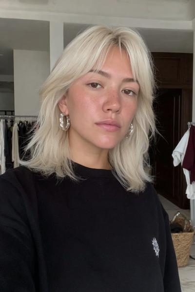 Die eingedrehten Spitzen und der kompakte Pony geben dem mittellangen Platin-Look Attitüde. Ich liebe den Kontrast aus süß und edgy – ein Hauch Retro, gestylt mit Hitzeschutz und Rundbürste.