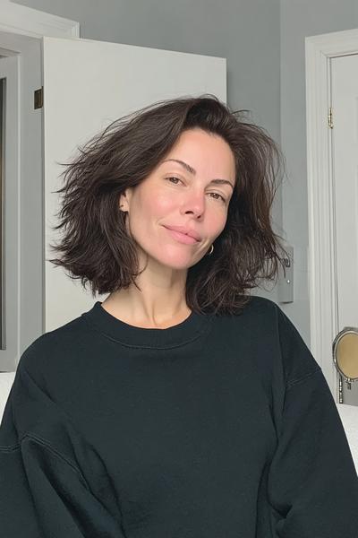 Dunkler, texturierter Bob, mittellang und bewusst messy. Mit aschigen Tonern bekommt er eine subtile graue Kühle. Knetet Schaum ins feuchte Haar, lufttrocknen lassen – so bleibt der Look frech und soft.