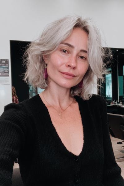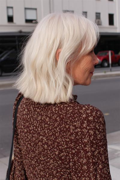 Die fransigen Spitzen geben dem Look sofort Attitude. Ein lockerer Seitenscheitel, etwas Salzspray, fertig ist die freche Alltagsfrisur. Ich liebe, wie das graue, mittellange Haar dadurch leicht und dynamisch fällt.