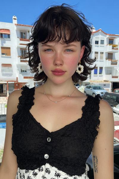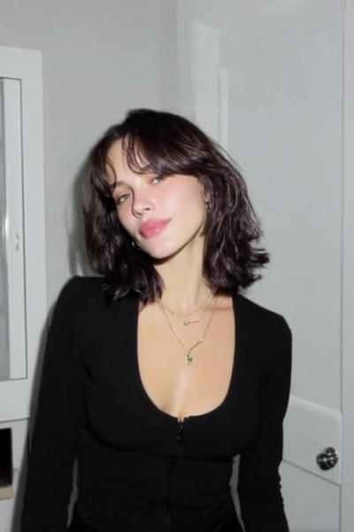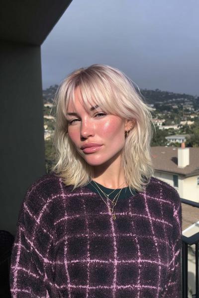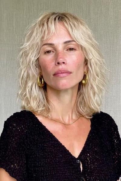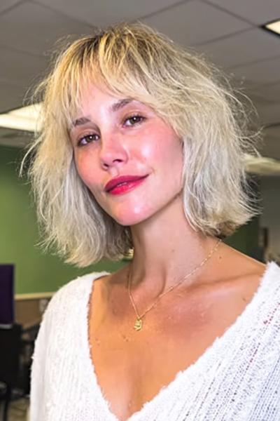 Soft gestufte Längen und ein fransiger Pony machen den Look lebendig. Ein wenig Sea-Salt-Spray, dann kneten – so entsteht diese mühelose Mittellänge mit coolem Day-After-Feel.