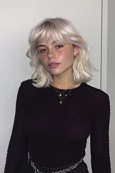 Schneeweißer Mittellang-Cut mit Long-Fringe, frech