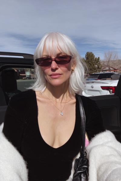 Der hohe Bun lässt den silbergrauen Pony glänzen – frech, frisch, super alltagstauglich. Ein paar Face-Framing-Strähnen, etwas Trockenspray, fertig. Ich mag die Undone-Leichtigkeit, die trotzdem bewusst gestylt wirkt.