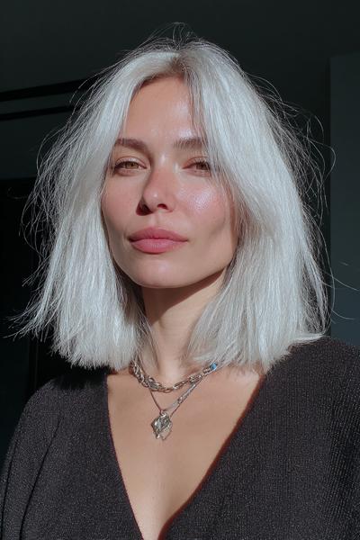 Ein eleganter, mittellanger Schnitt in hellsilber – clean, aber aussagekräftig. Ich liebe den Sleek-Look mit Seitenscheitel; Serum glättet, dann leicht auskämmen. So bleibt die Kontur edel und die Farbe strahlt luxuriös.