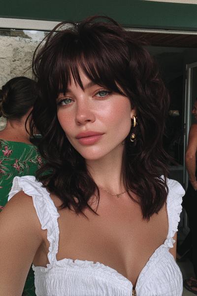 Lockere Wellen, fransige Stufen und ein sanfter Seitenscheitel – dieser mittellange Shag wirkt mühelos und edel. Mit Salzwasserspray und diffuserm Föhn entsteht bewegte Struktur, die Gesichtszüge weich umrahmt.