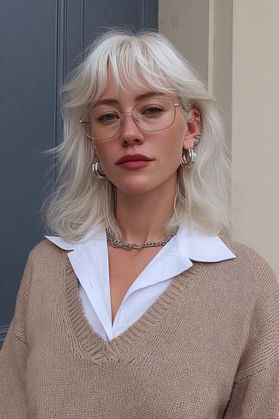 Dieser choppy Shag spielt mit fransigem Volumen und einer geometrischen Brille – urban und smart. Ein kurzer Föhn mit Rundbürste hebt den Ansatz, danach etwas Trockenshampoo für Halt und ein paar lässige, unperfekte Spitzen.