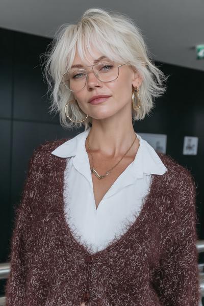 Dieser wavy Shag-Bob mit softem Pony spielt herrlich mit Textur und Licht. Die Brille wird durch fransige Stufen eingerahmt. Ein Hauch Salzspray, Diffusor, fertig: lässig, jugendlich, aber ohne Mühe – ideal für aktive Tage.