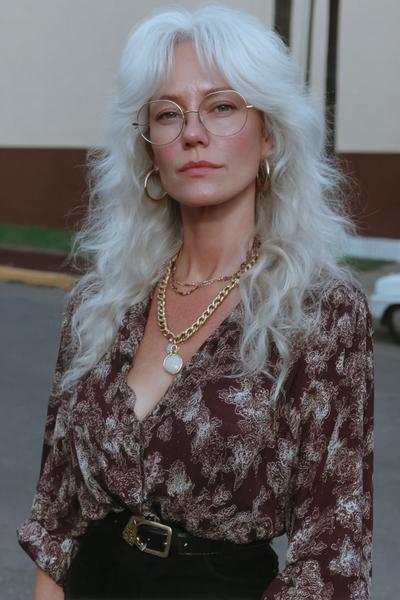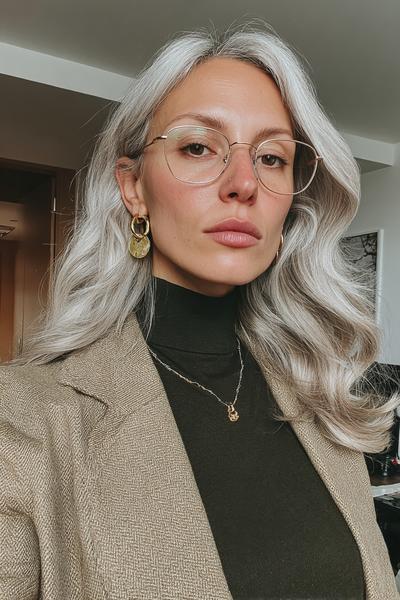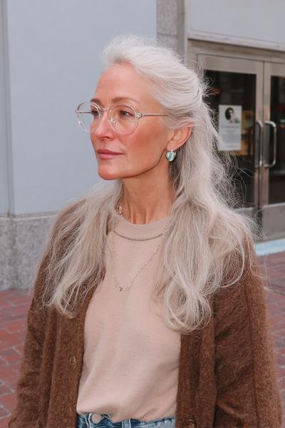 Diese lang fallenden Silberwellen leben von soften Stufen und natürlichem Volumen. Die schmale Brille streckt das Gesicht, während texturierende Creme die Spitzen bündelt. Für Frauen ab 50 ideal: feminin, leicht, aber absolut modern.