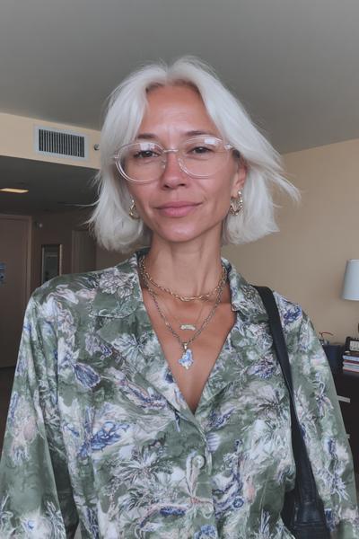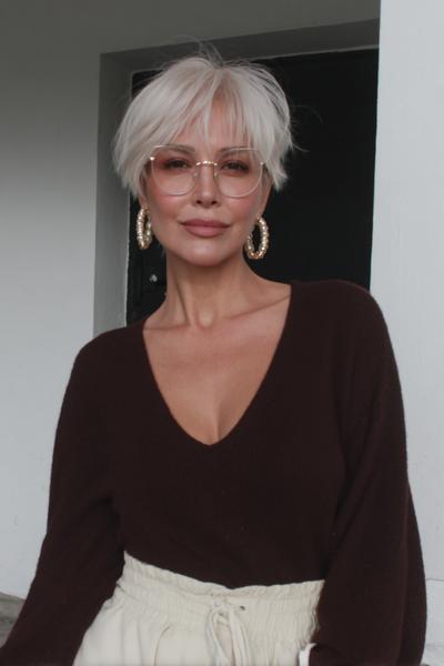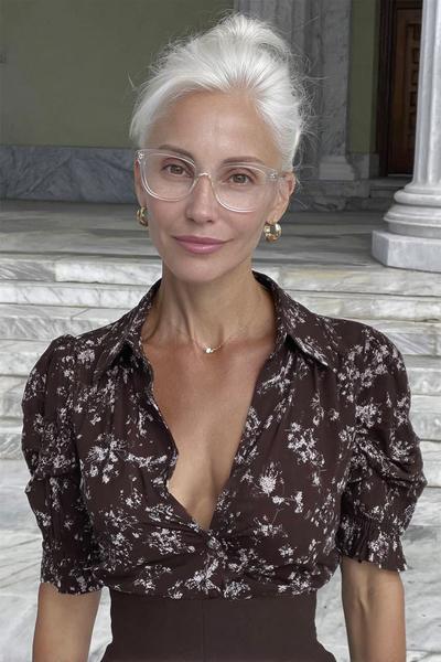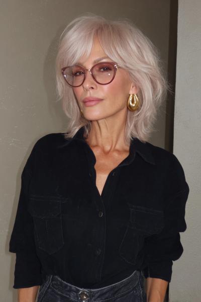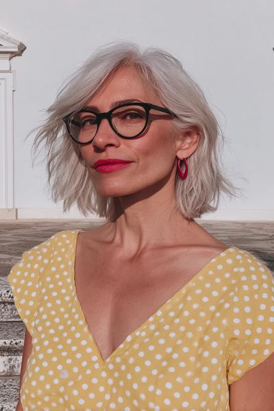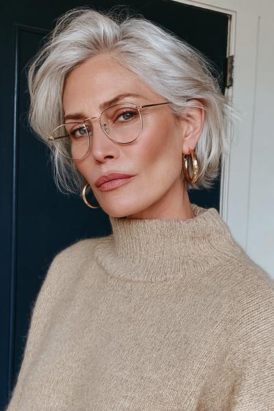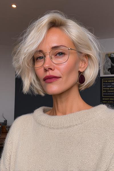 Ein kurzer, gestufter Bob mit seitlichem Scheitel bringt das Silber zum Leuchten. Die feine Metallfassung bleibt elegant. Mit Rundbürste anheben, etwas Volumenschaum, dann Luftigkeit fixieren – smart, klar, modern.