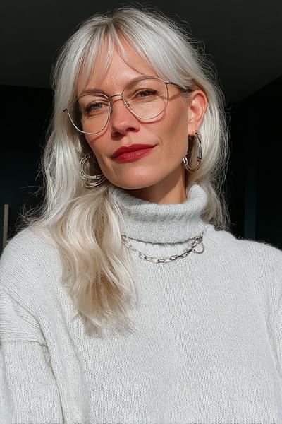 Kaltblonde Längen mit seitlichem Pony und filigraner Brille – ab 50