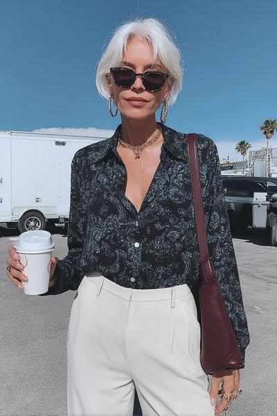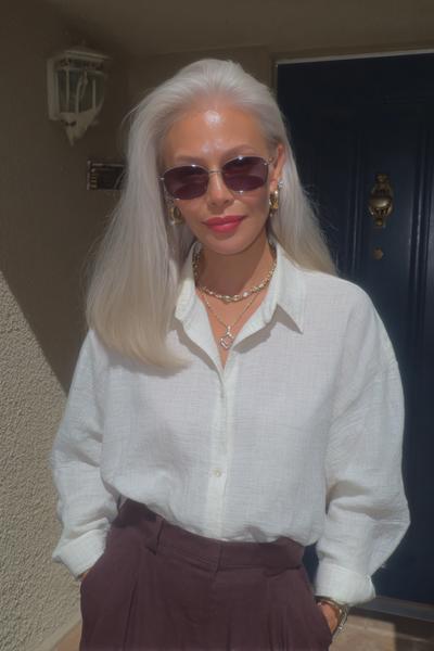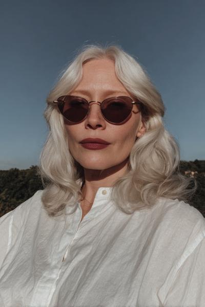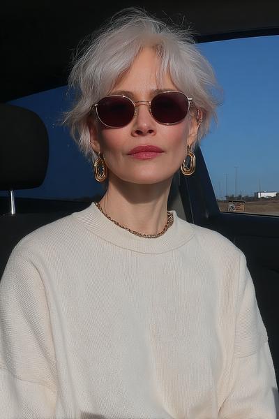 Sleek, zurückgestyltes Silberhaar mit klarer Kante – die getönte Sonnenbrille setzt den Chic. Für spiegelnden Glanz: Blowout mit Paddlebrush, danach ein Hauch Smoothing-Serum. Ich liebe diesen minimalistischen, kraftvollen Auftritt ab 50.